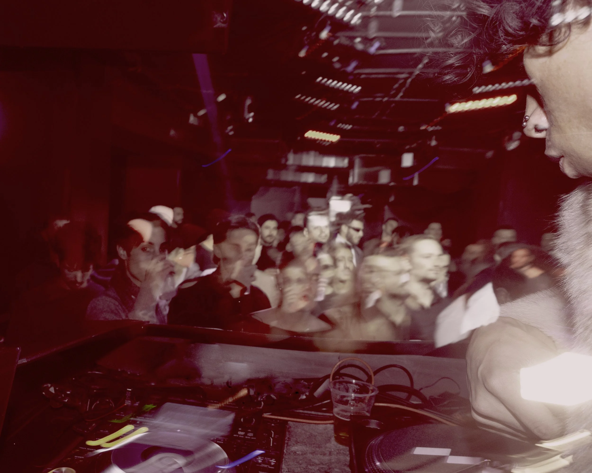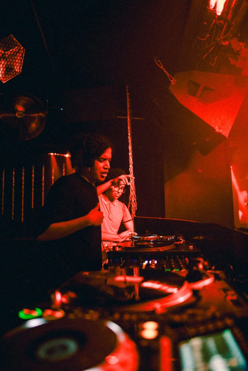 Una folla di persone in un club notturno con luci rosse, due DJ che suonano alla consolle e un neon luminoso sulla parete.