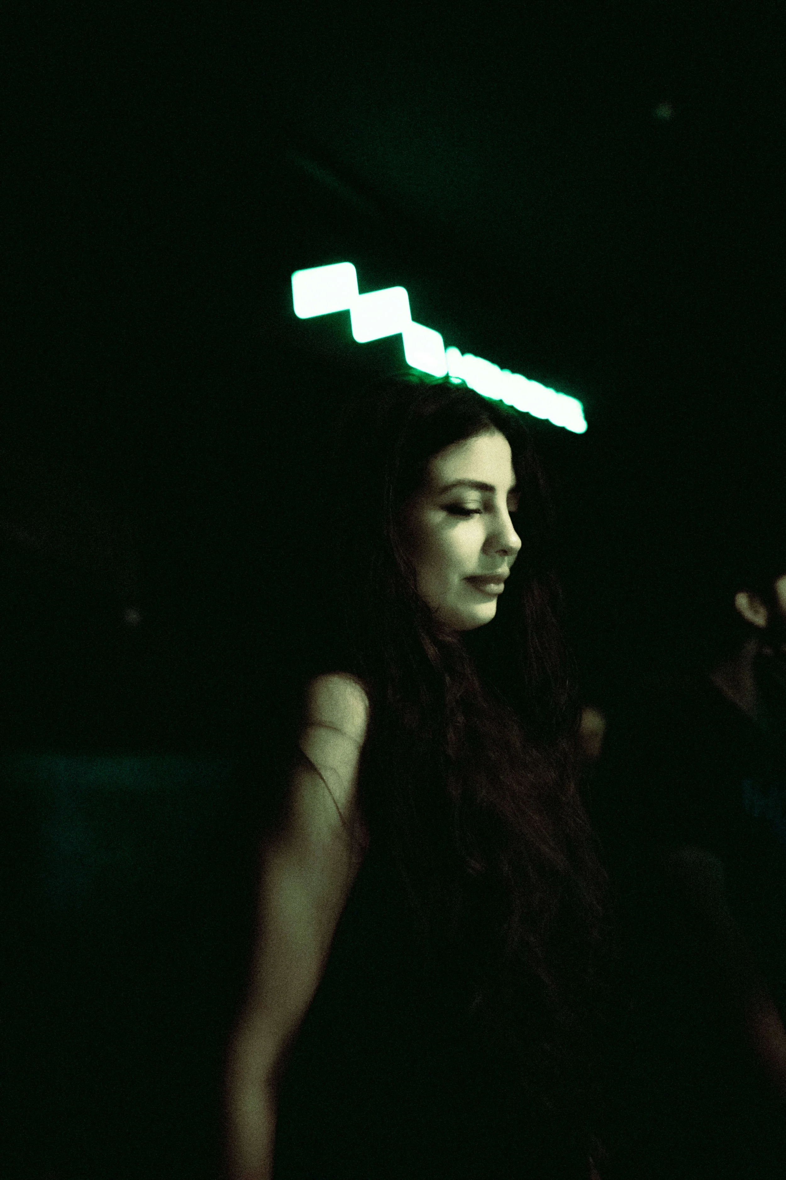 Ragazza con capelli lunghi e ricci in un ambiente scuro, illuminata da una luce verde neon
