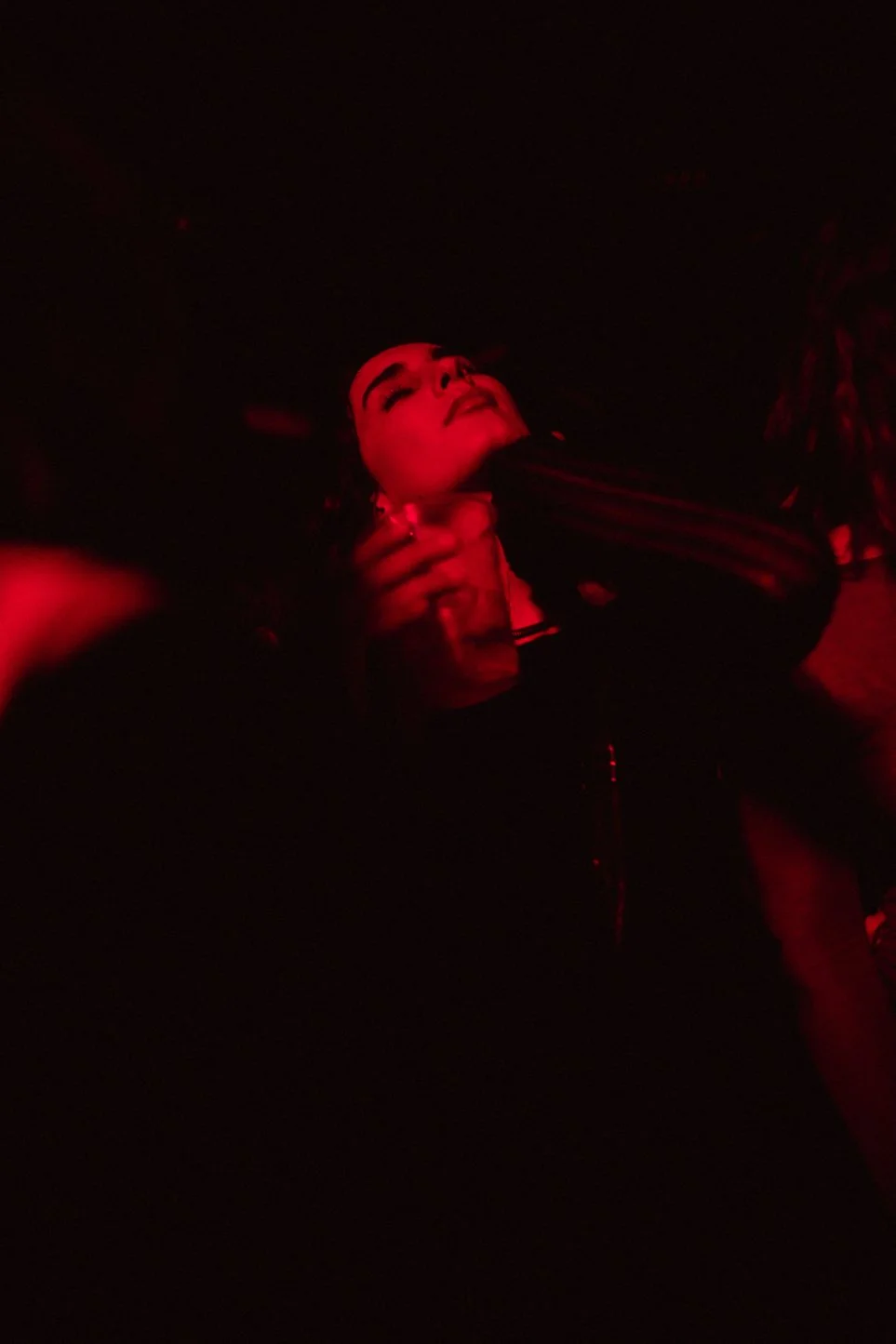 Una donna in un locale notturno con luci rosse, che sembra divertirsi e ballare, mentre tiene un bicchiere in mano.