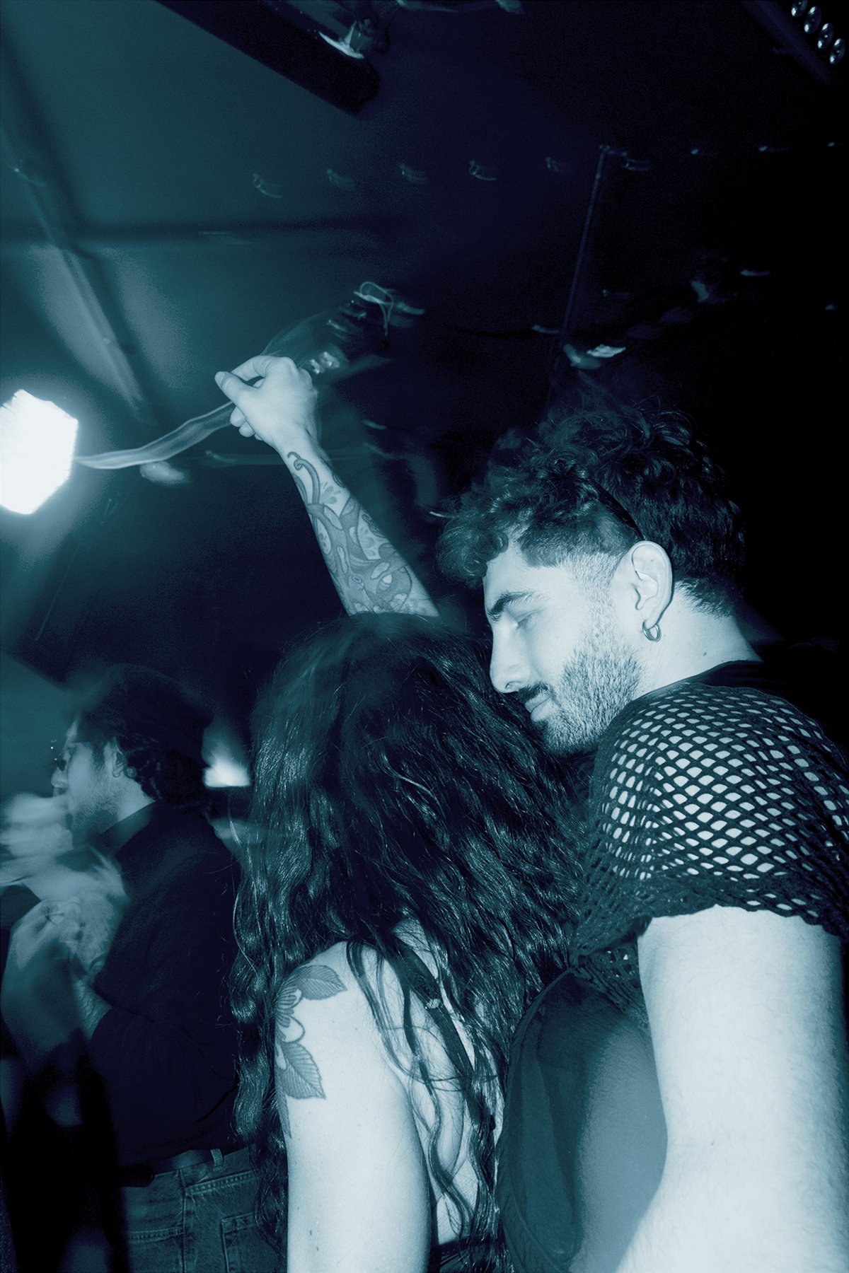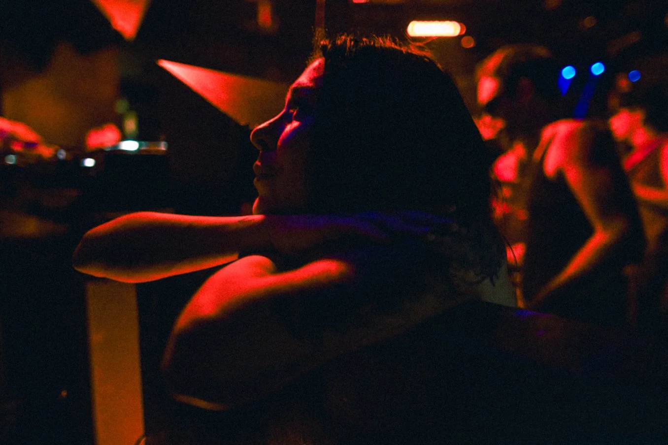Due persone che si abbracciano strettamente in un ambiente con luci rosse, probabilmente una discoteca.