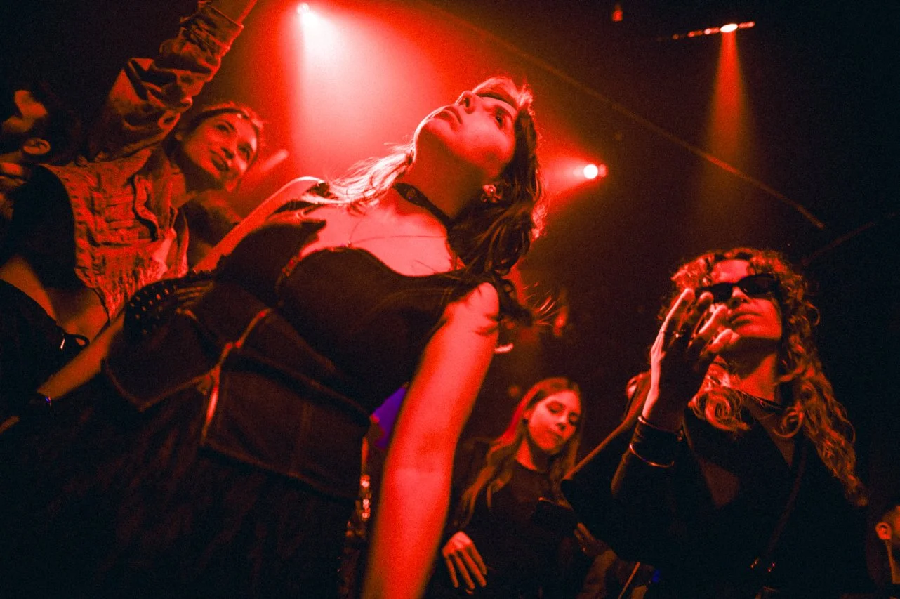 Gruppo di giovani che ballano in un ambiente con luci rosse, con una ragazza dai lunghi capelli ricci al centro.
