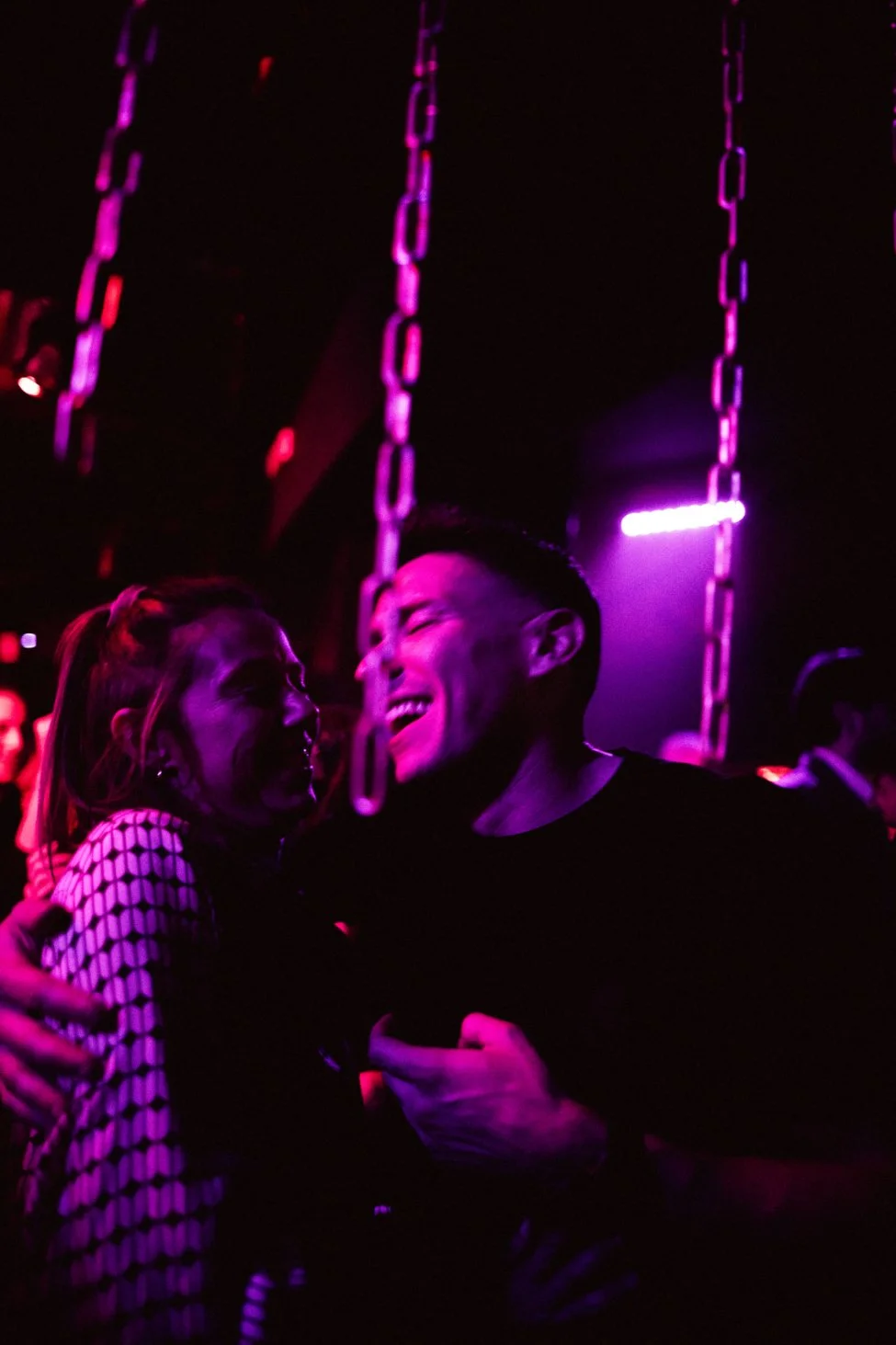 Due persone che ballano in un club, uno con braccia alzate e un sorriso, l'altra con un sorriso e un abbigliamento alternativo con tatuaggi visibili.