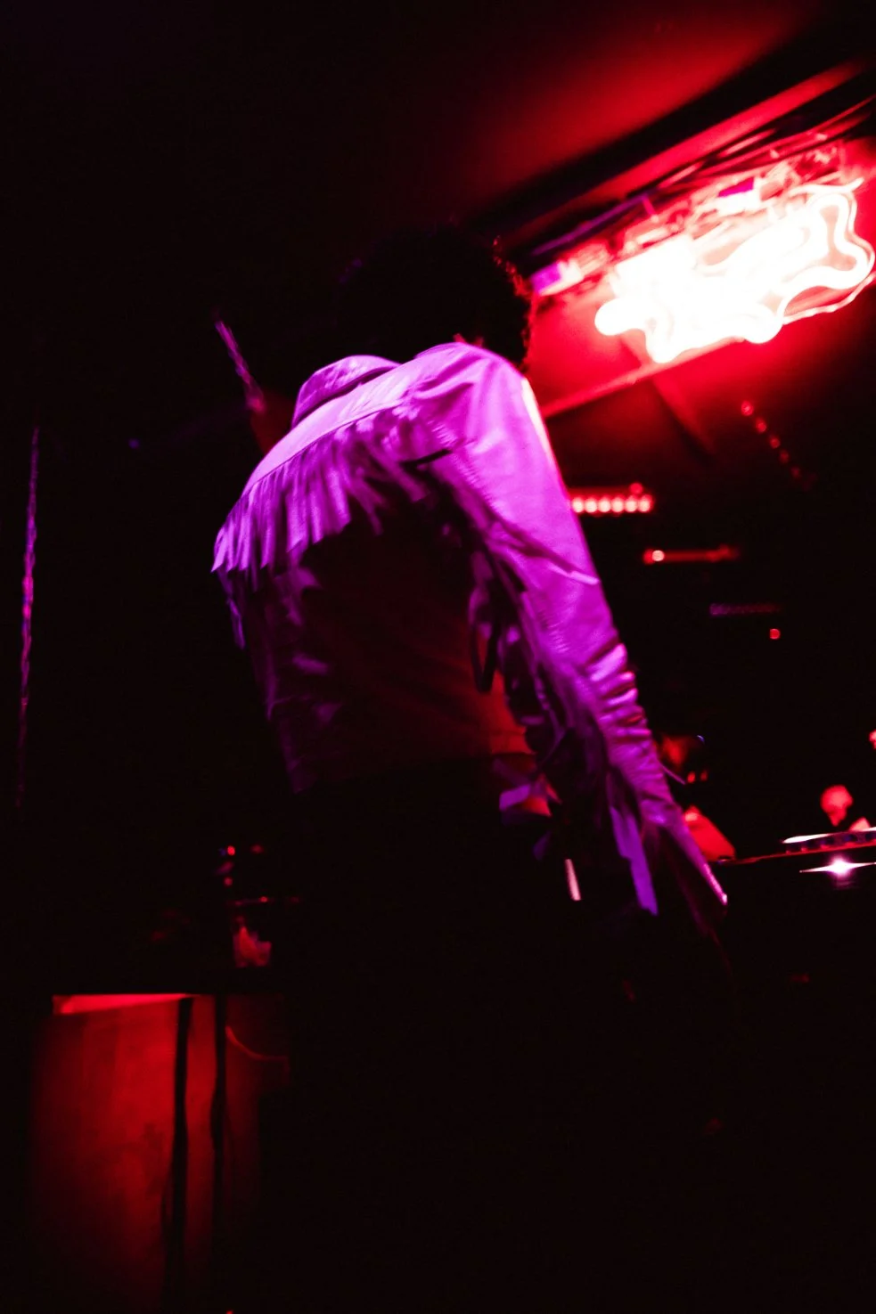 Persona con capelli ricci e occhiali da sole, indossa una maglietta con scritte, in un locale notturno con illuminazione neon.