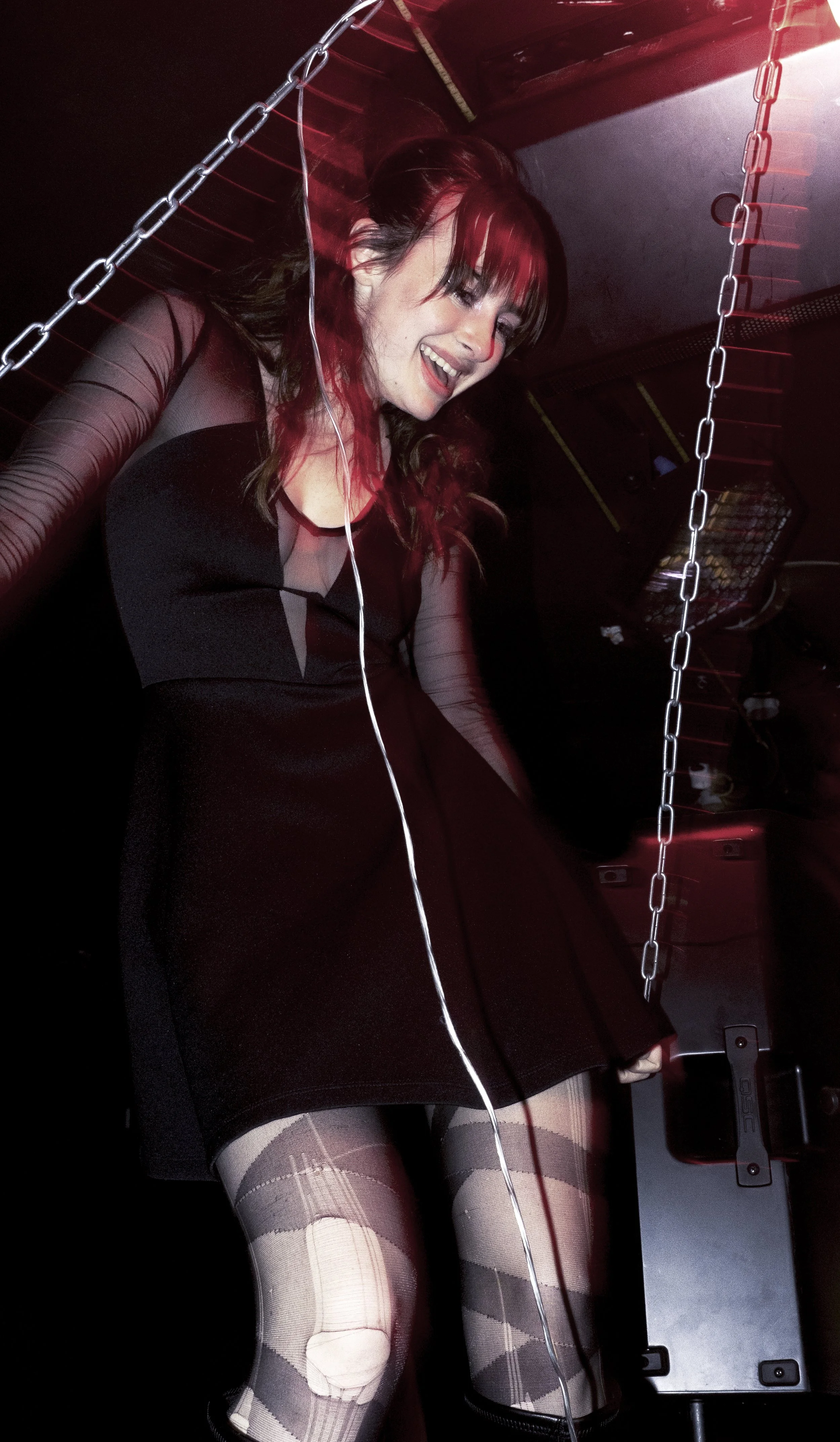 Ragazza con capelli rossi, orecchini grandi e abbigliamento nero, al buio in un locale o club, con altre persone sullo sfondo.