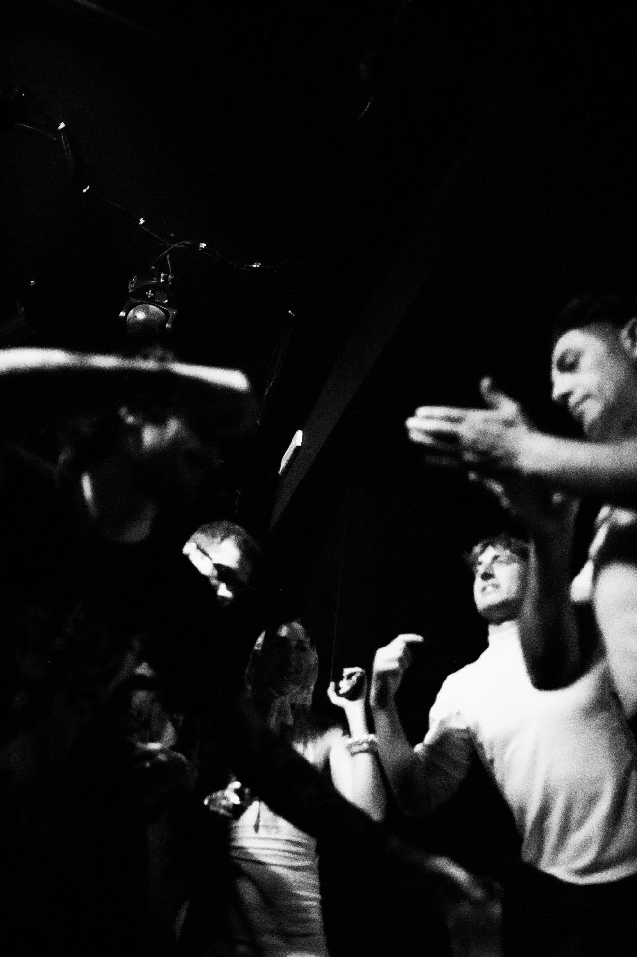 Un gruppo di persone che ballano e si divertono in un pub o locale, scena in bianco e nero.