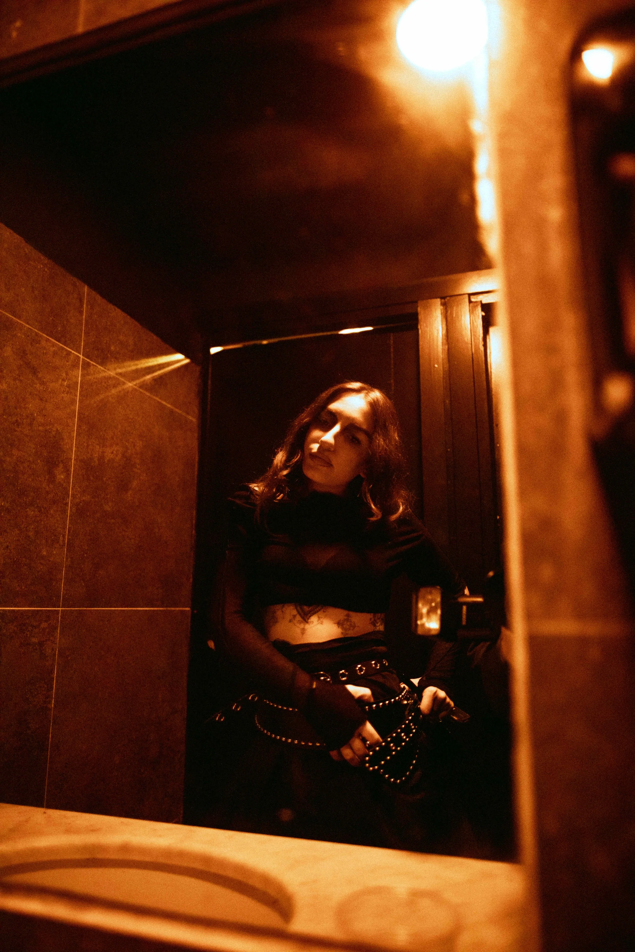 Ragazza con capelli ricci, vestita di nero, in un bagno con illuminazione calda, riflessa in uno specchio sopra il lavabo.